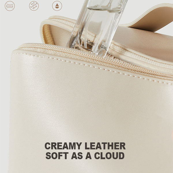 Doppellagige Cloud-Kosmetiktasche aus cremefarbenem Leder. das weich und hochwertig wie eine Wolke ist.